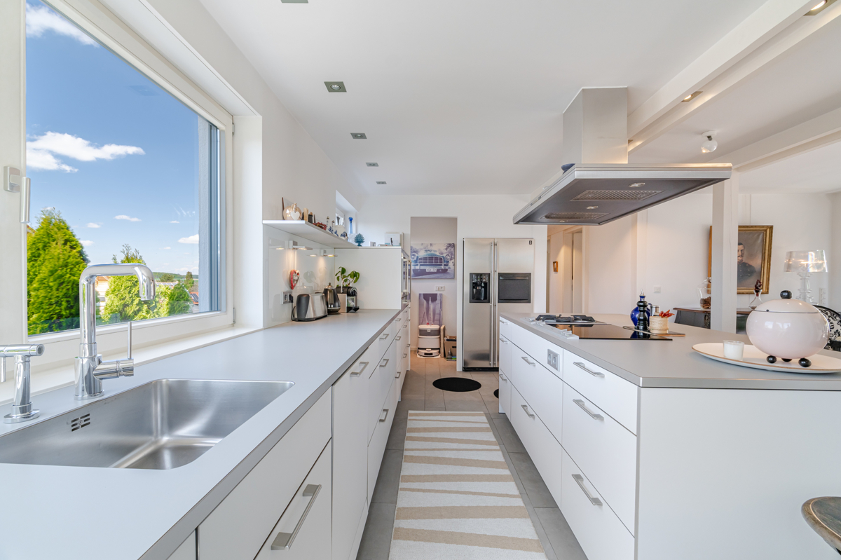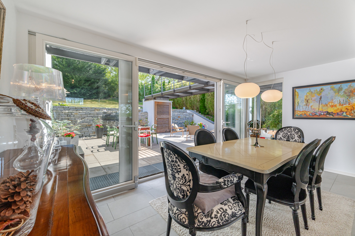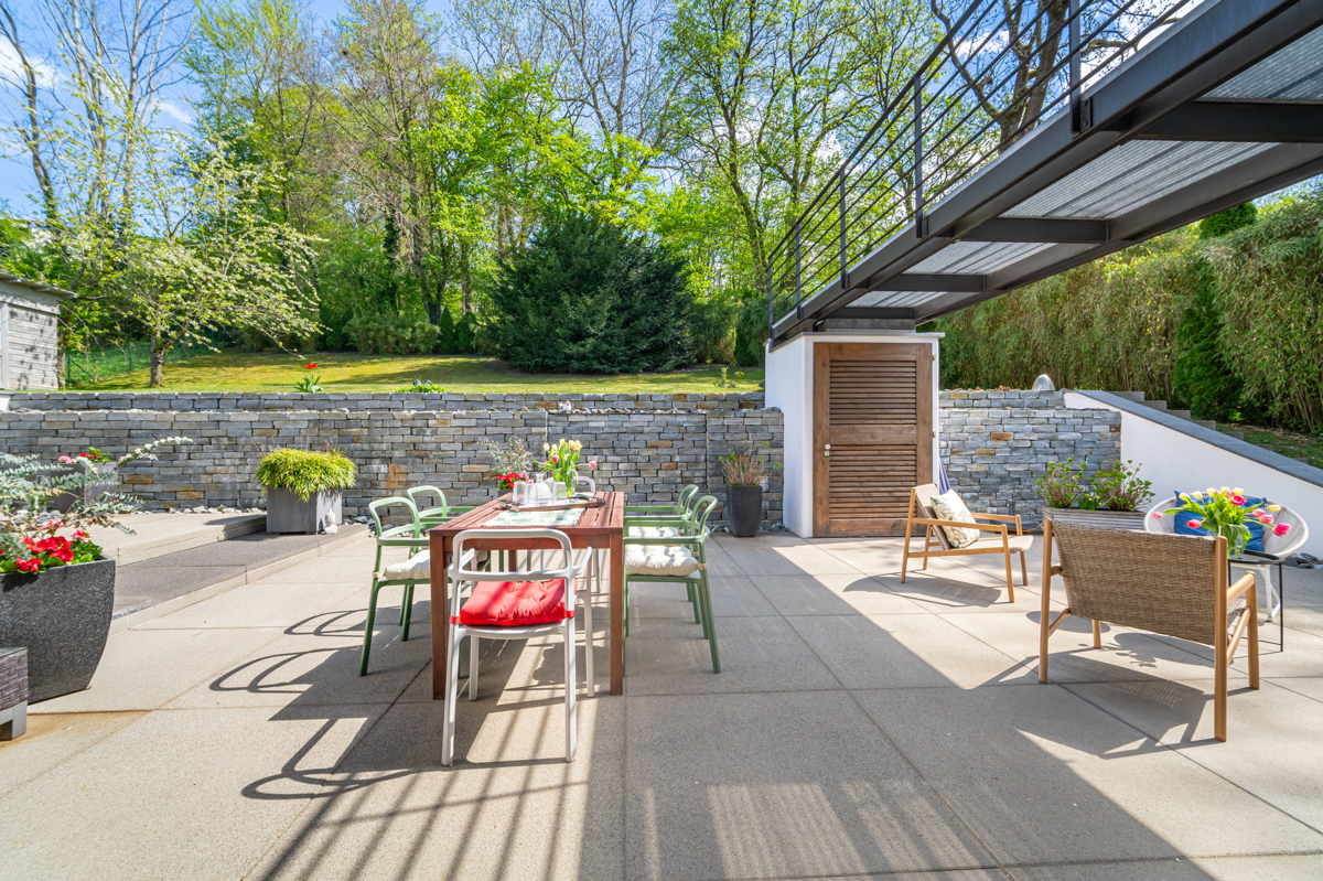Zimmern, von denen sich vier sehr gut als Schlafzimmer eignen, zwei Badezimmern, rund 244m² Wohnfläche und ca.73m² Nutzfläche bietet das Haus seinen Bewohnern viele Freiräume. Die stilvolle Terrassen-und Balkon-Anlage wurde zum Teil bei der Wohnflächenberechnung berücksichtigt. Der große und pflegeleichte Garten strahlt mit seinen vielfältigen Balkon- und Terrassenanlagen und seinem alten Baumbestand Ruhe und Geborgenheit aus. Das Haus wirkt großzügig und elegant und die hochwertige Innenausstattung, wurde konsequent von regionalen Handwerks-Betrieben umgesetzt. Ein cleveres Beleuchtungskonzept mit „Occhio“ und „louis poulsen“ Leuchten im Außen- und