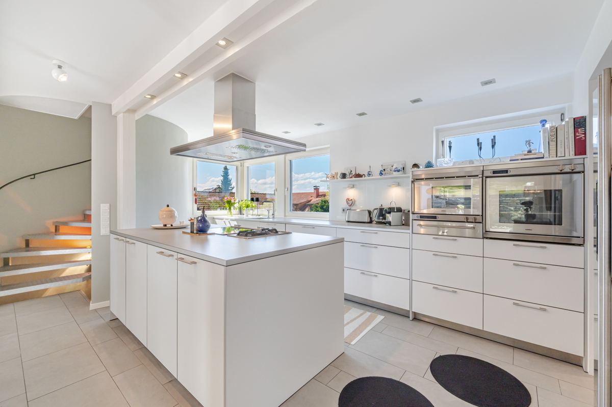 - „bulthaup Küche“ mit Gas- und Elektroherd, Teller-Rechaud, Dampfgarer und Side by Side-Kühlschrank