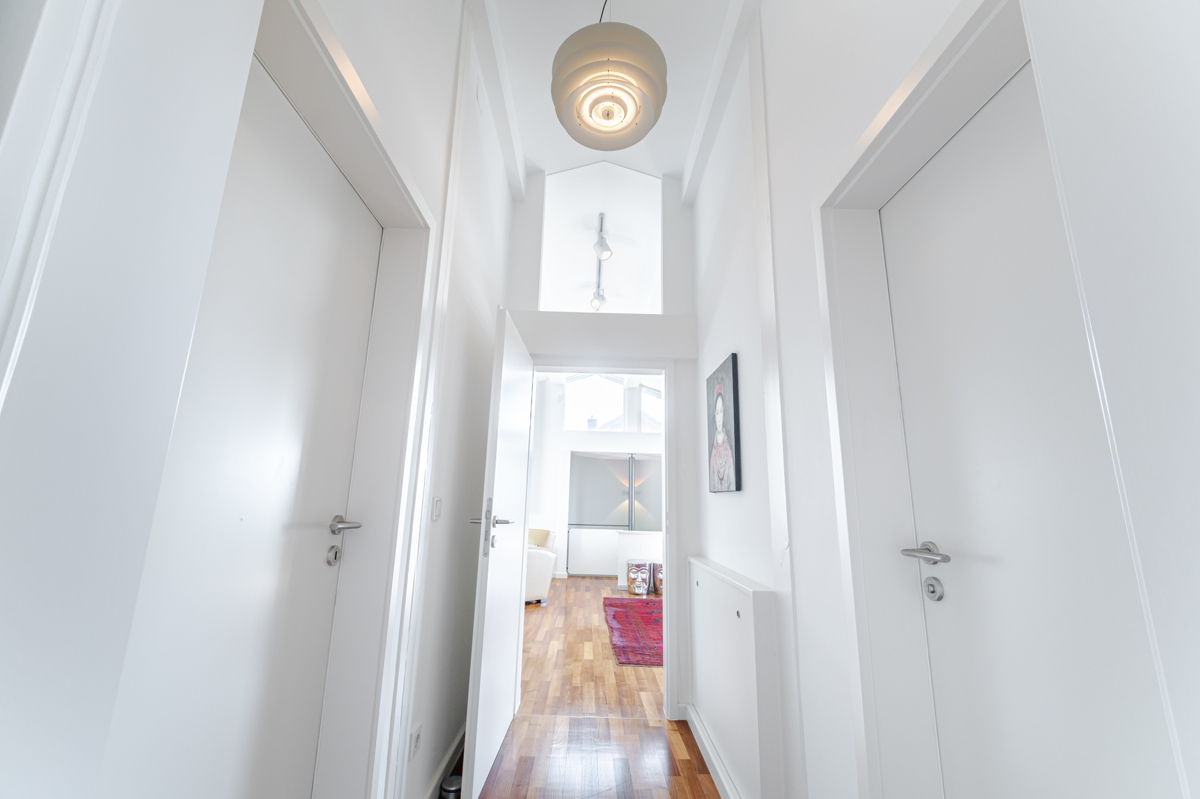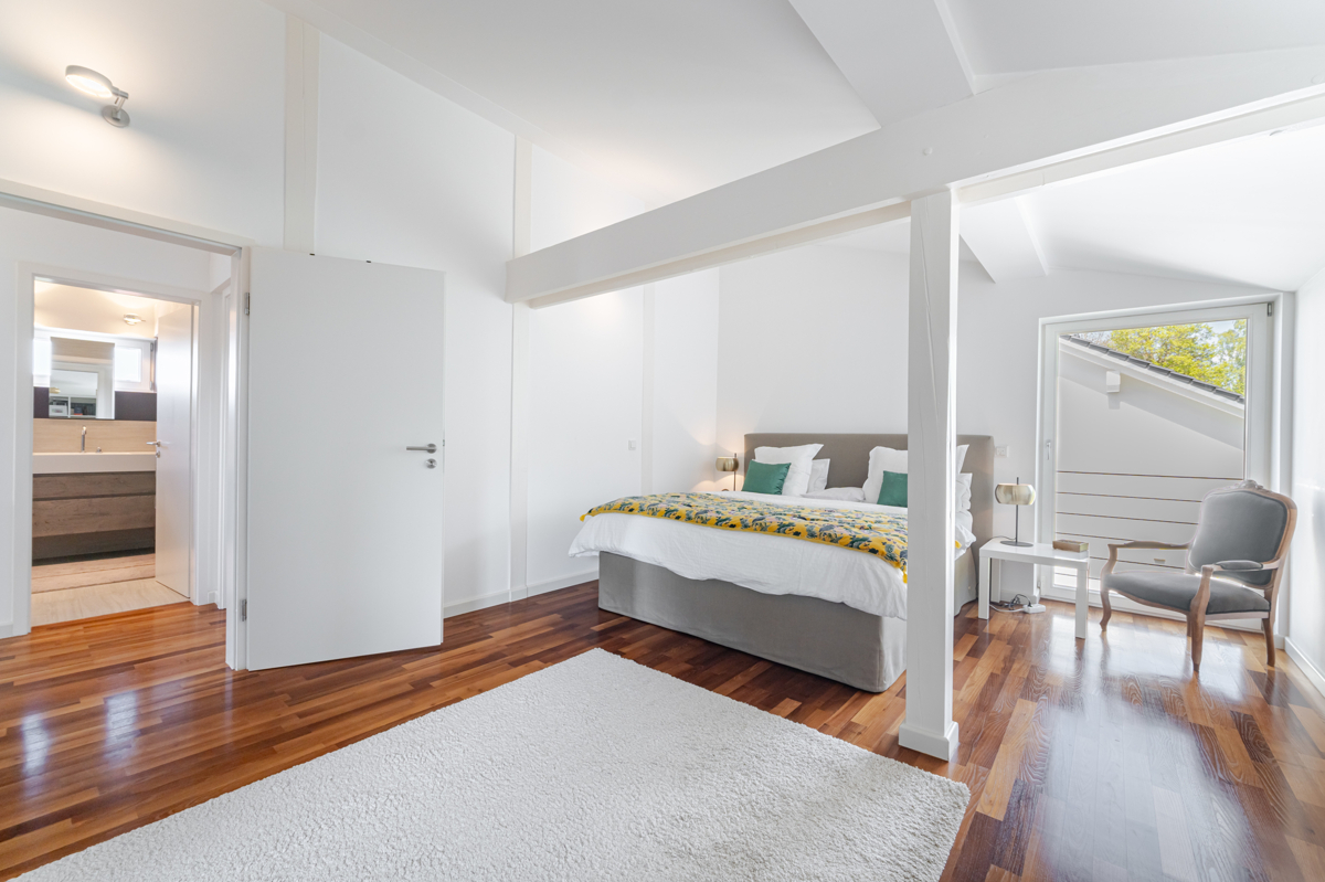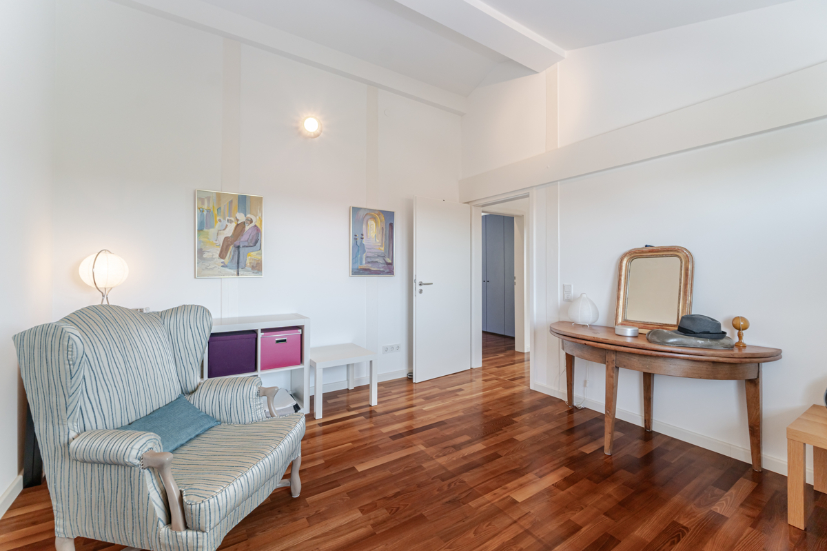 - Dachgeschoss: große Bodenfliesen und Akazien-Vollholzparkett