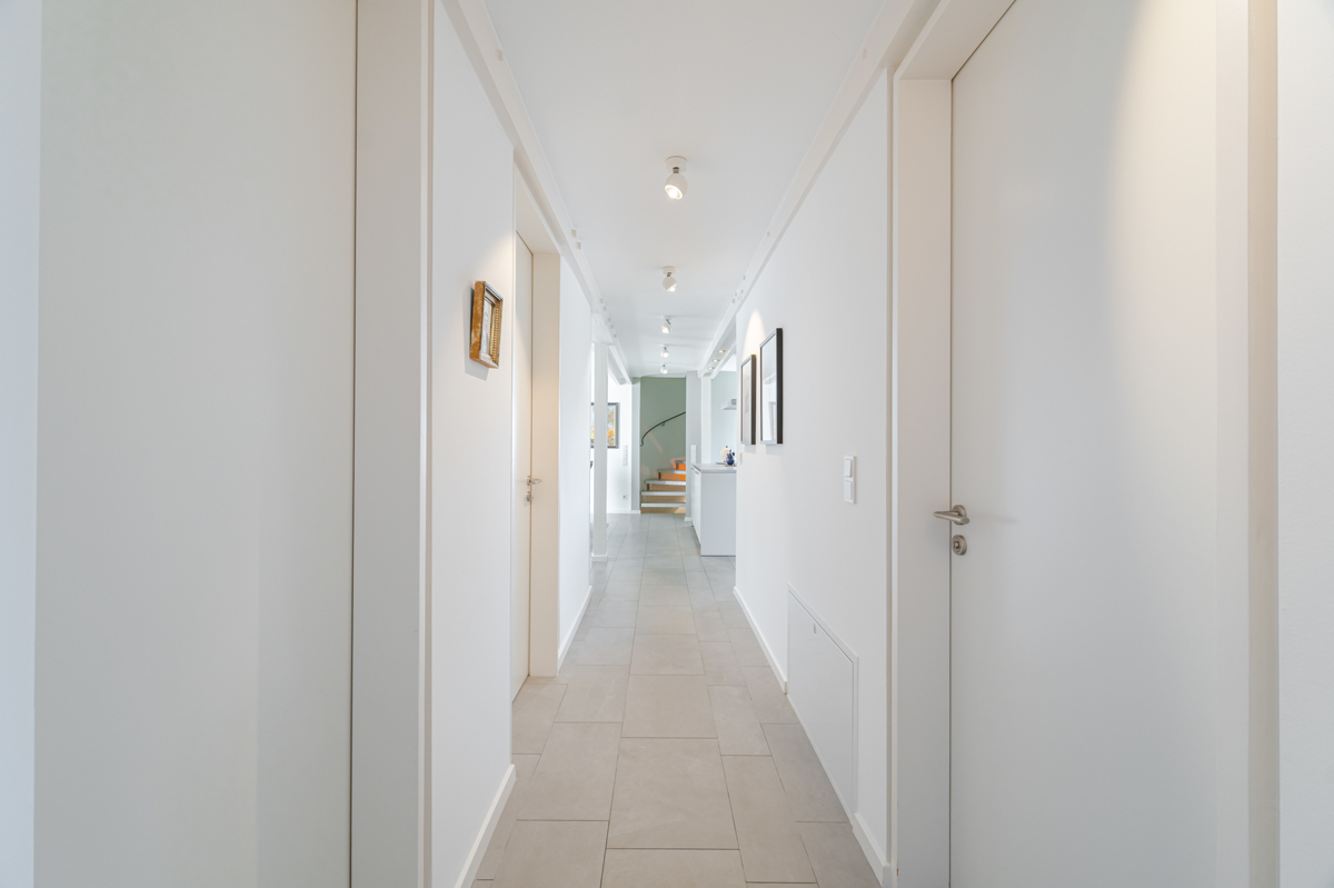 - Erdgeschoss: große Bodenfliesen und Akazien-Vollholzparkett
